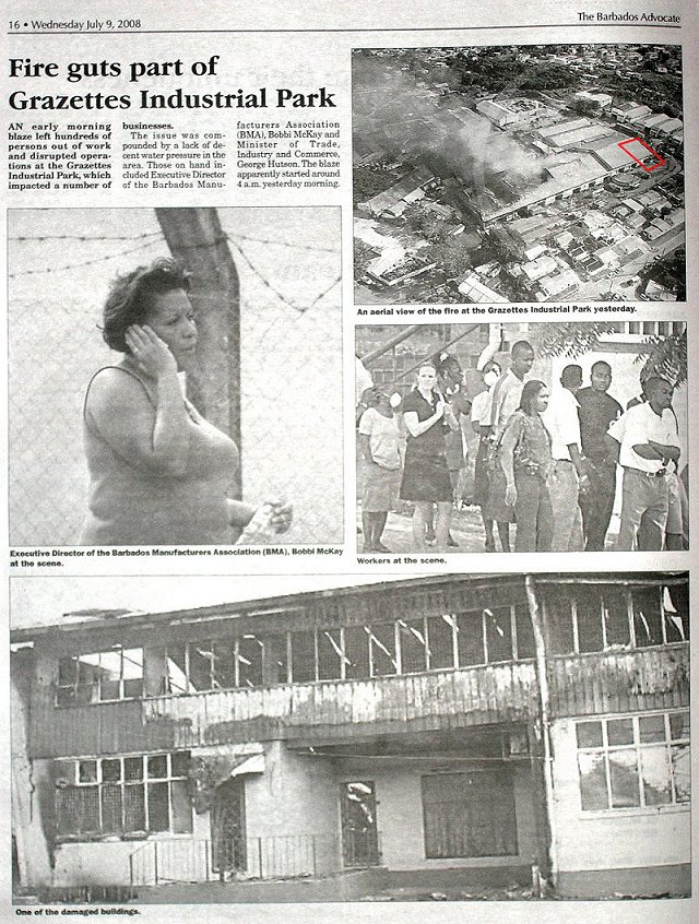 In the early morning hours of July 8th, 2008 a huge fire destroyed almost an entire quarter of companies and workshops in Grazettes Industrial Park. About 7 of them burned down completely. Contrary to what has been broadcasted in the news, fortunately the fire did NOT reach the workshop of Glassfibre Products Ltd., as you can see in the photograph below. The red rectangle outlines the location of the company. Due to these lucky circumstances we are still in business. However, we feel very sorry for our neighbour companies, which became victims of this terrible blaze and in particular, their employees, who are going to face a hard time in the near future.